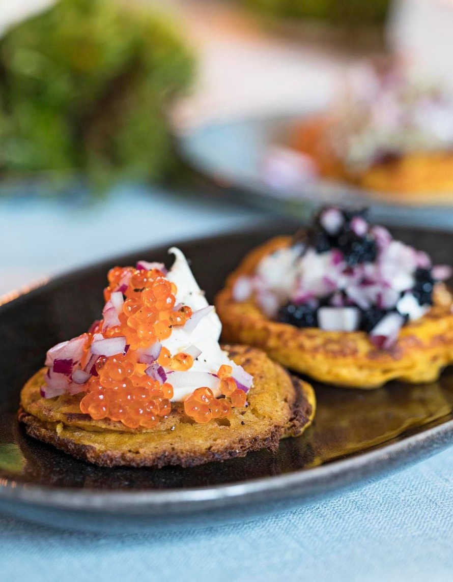 Blinitaikina saa täyteläisen makunsa bataatista. Tarjoa blinit talven juhlissa alkuruokana smetanan, mädin ja punasipulisilpun kanssa.