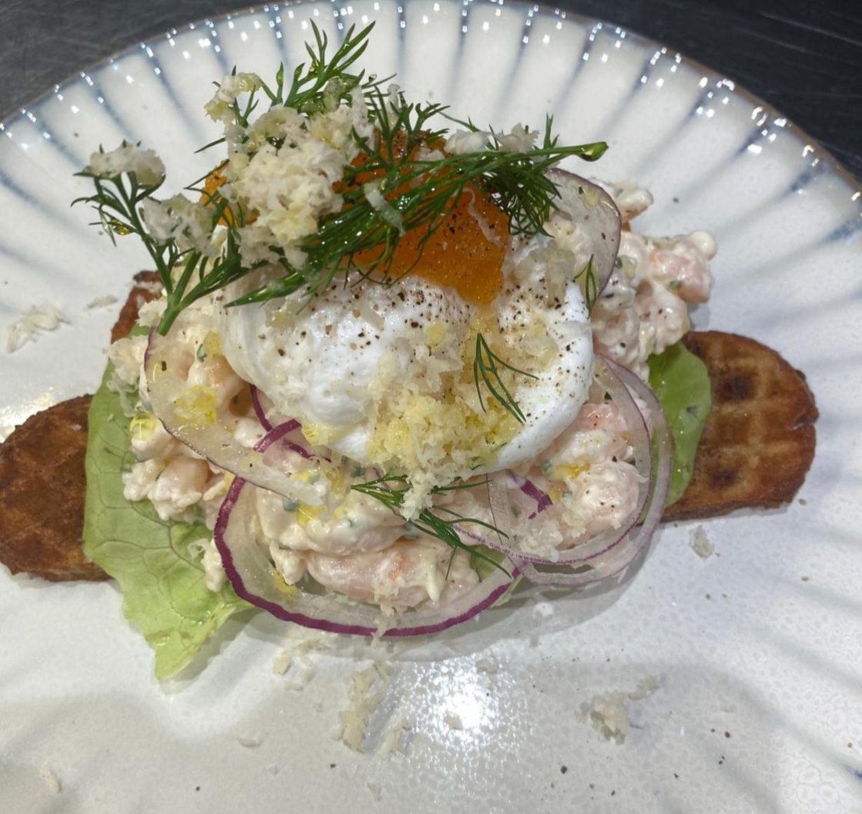 - Asettele skagenröra kuuman vohvelin päälle. Viimeistele halutessasi muikunmädillä, punasipulilla ja tillillä sekä ruohosipulilla ja mustapippurilla.
