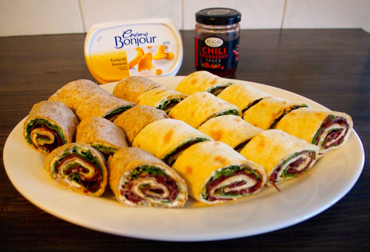 Voit tarjota kokonaisina wrappeina tai viistoon leikattuina cocktailpaloina.