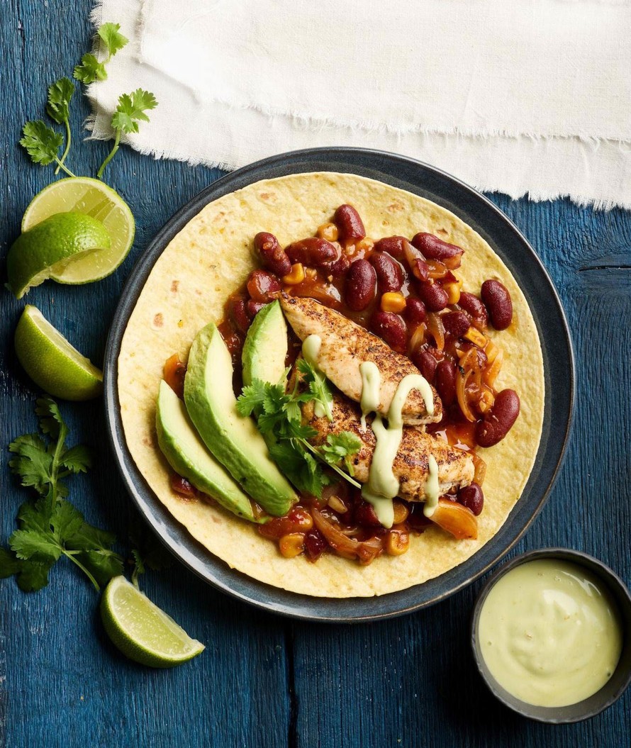 - Kuumenna tortillat pannulla tai mikrossa. Levitä päälle papukastiketta, kanapaloja, avokadoa ja korianteria. Tarjoa majoneesin ja limetin kanssa.