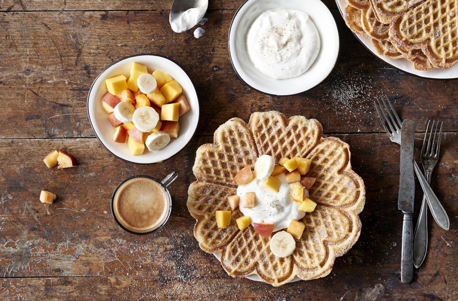 - Nosta vohveli sokeri-kaneliseoksen päälle ja käännä molemmin puolin. Laita vohvelit laakealle tarjoilulautaselle ja tarjoa heti rahkavaahdon, hedelmien ja Nespresso Envivo Lungo –kahvin kera.
