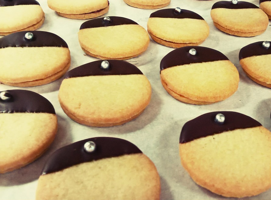 6. Kasta puoleen ylioppilaspikkuleivistä sulassa suklaassa ”lipat” ja lisää koristerae. Pursota lipattomille pikkuleiville hilloa ja paina lipallinen ylioppilaspikkuleipä päälle.