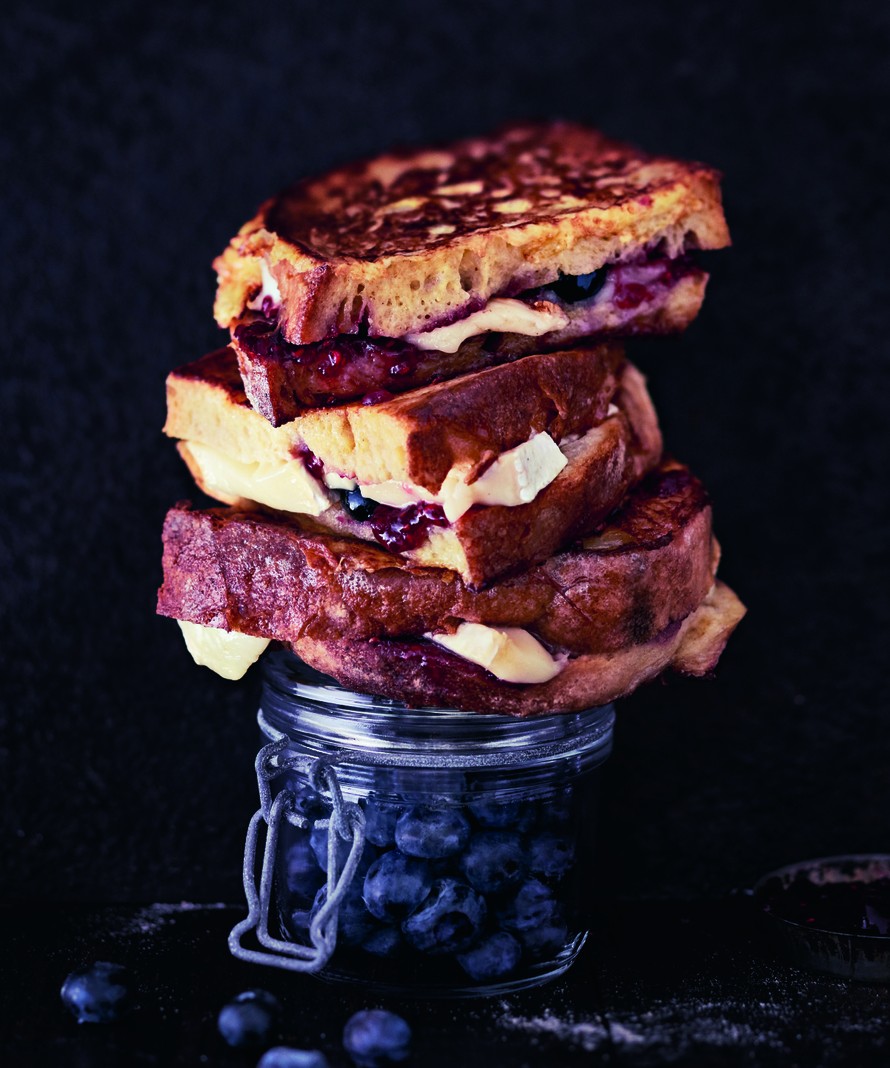 - Voitele leivät voilla. Levitä neljälle leivälle hilloa ja jaa mustikat päälle. Viipaloi juusto ja laita se leiville. Laita loput leipäviipaleet kansiksi.