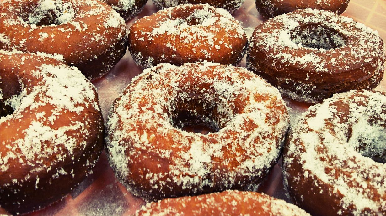 Kuumenna öljy teräskattilassa tai valurautapadassa noin 175 asteeseen. Öljy on sopivan kuumaa, kun paahtoleipäpala ruskistuu kauniisti minuutissa. Pane donitsi varovasti kuumaan öljyyn ja kypsennä 2-3 kpl kerrallaan niin, että ne kelluvat vapaasti öljyssä. Kypsennä 1-2 minuuttia ja käännä, kun paistopinta on kauniin ruskea. Jatka kypsentämistä noin minuutti toiselta puolelta. Nosta donitsit reikäkauhalla talouspaperin päälle hetkeksi valumaan ja lisää seuraavat donitsit öljyyn paistumaan. Sokeroi donitsit.