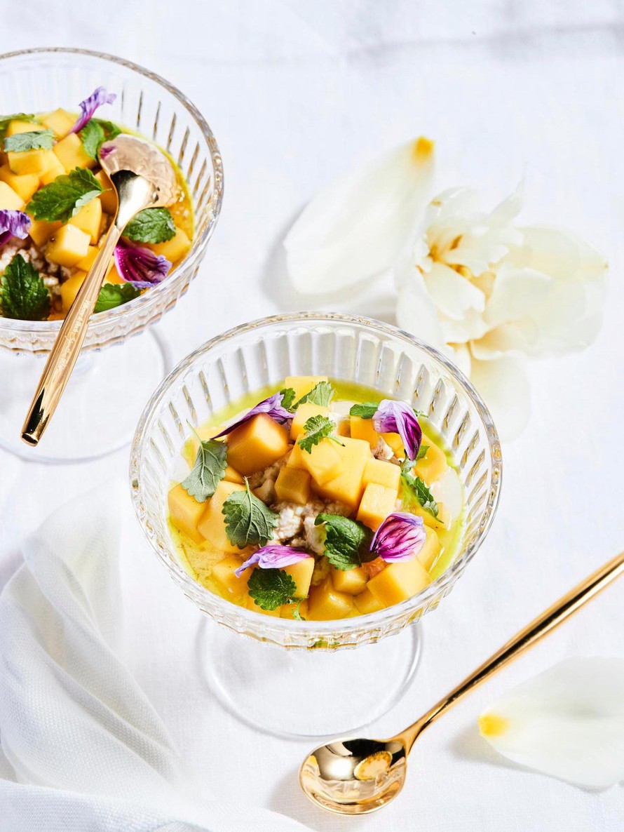 Jaa mascarponevaahto tarjoilukulhoihin ja ripottele mangokuutiot päälle. Lusikoi myös karamellilientä kulhoon. Koristele annokset tuoreella sitruunamelissalla. Voit lisätä koristeeksi myös syötäviä kukkia.