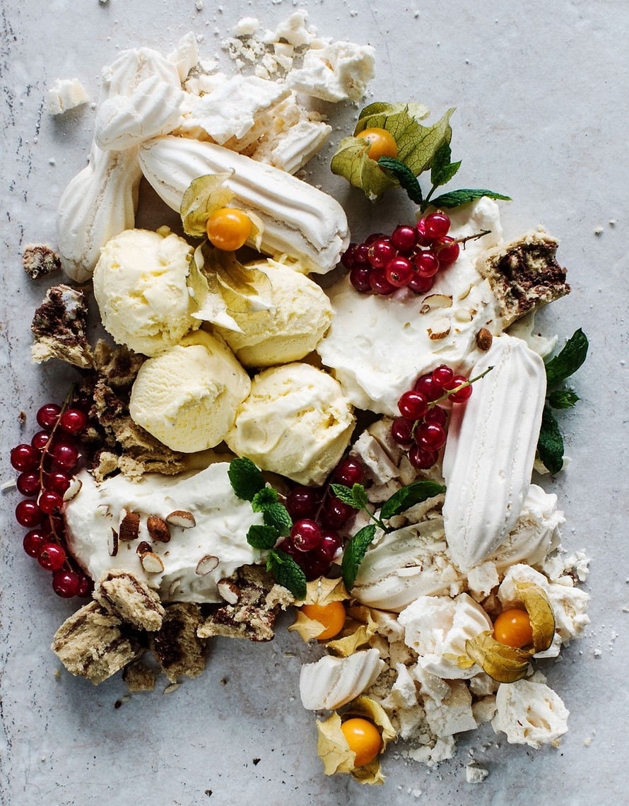 Näyttävän jälkiruuan makuja on helppo muunnella: vaihda jäätelö sitruunasorbettiin, marjat hedelmiin ja valkosuklaa tummaan suklaaseen.