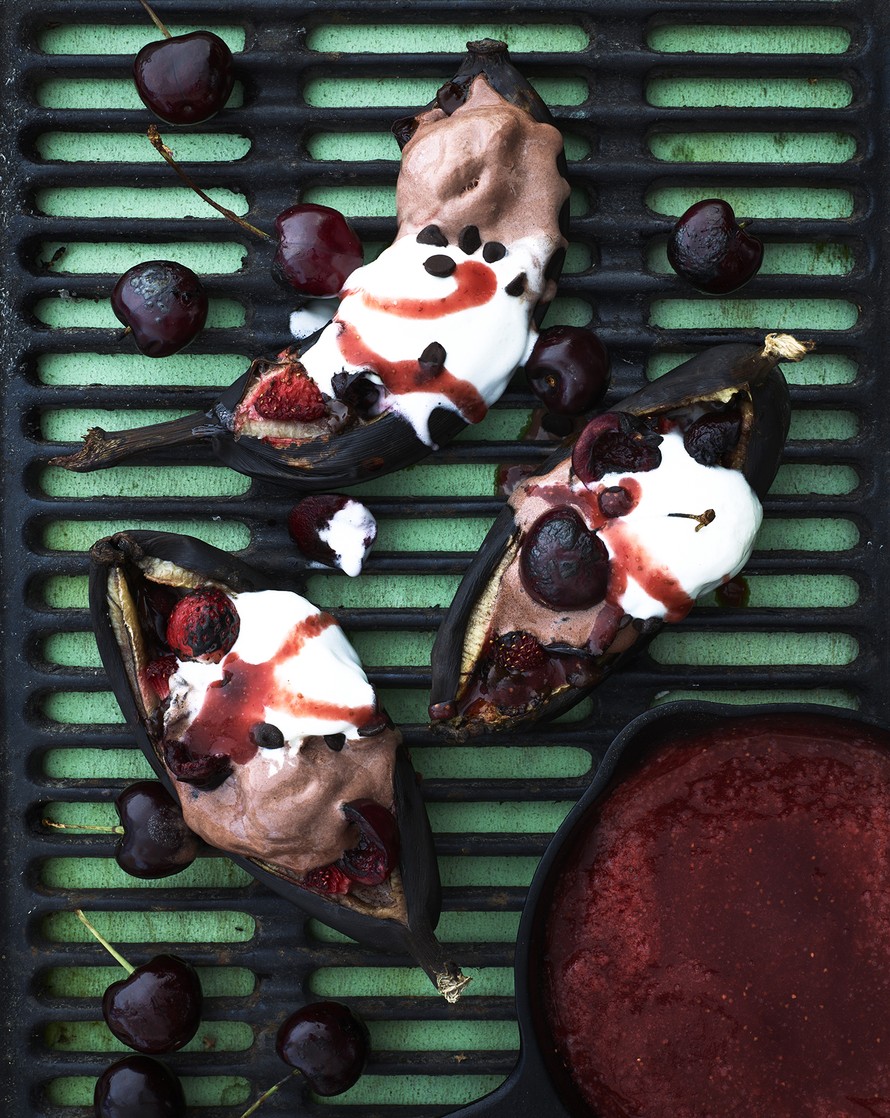 Klassikkojälkiruoka uudistui grillissä! Herkullisessa täytteessä kohtaavat kirsikat, mansikat ja suklaa. Tarjoa banaanit jäätelön ja lämpimän mansikkakastikkeen kanssa.