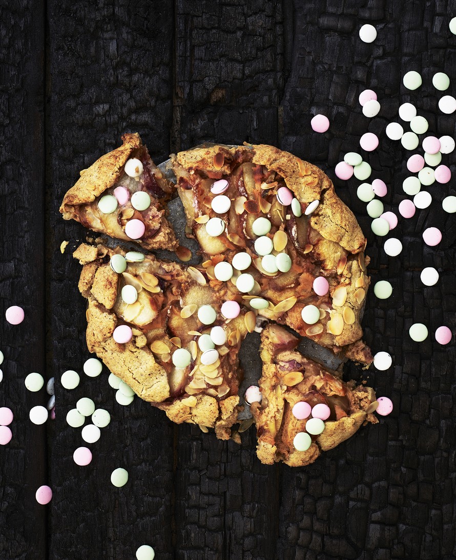 Kyllä, piirakan voi tehdä myös grillissä! Tämän version täyte on simppeli mutta superherkku: mascarponea, kinuskia, persikkaa ja piparminttuisia ranskanpastilleja.