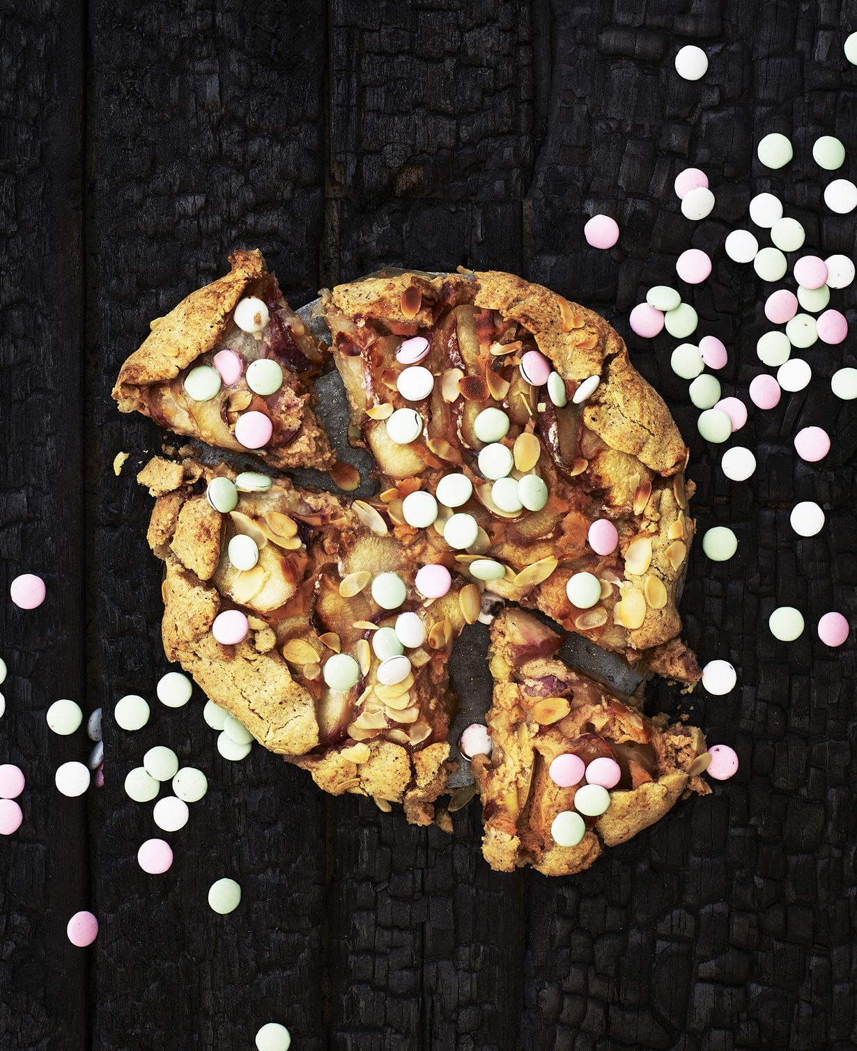 Yhdistä mascarpone ja kananmuna kulhossa. Sekoita kinuski joukkoon ja kaada täyte pohjan päälle vuokaan. Ripottele ranskanpastillit ja asettele lopuksi persikkapalat piirakan pinnalle. Taita taikinan reunat täytteen päälle ja ripottele mantelilastut pinnalle.