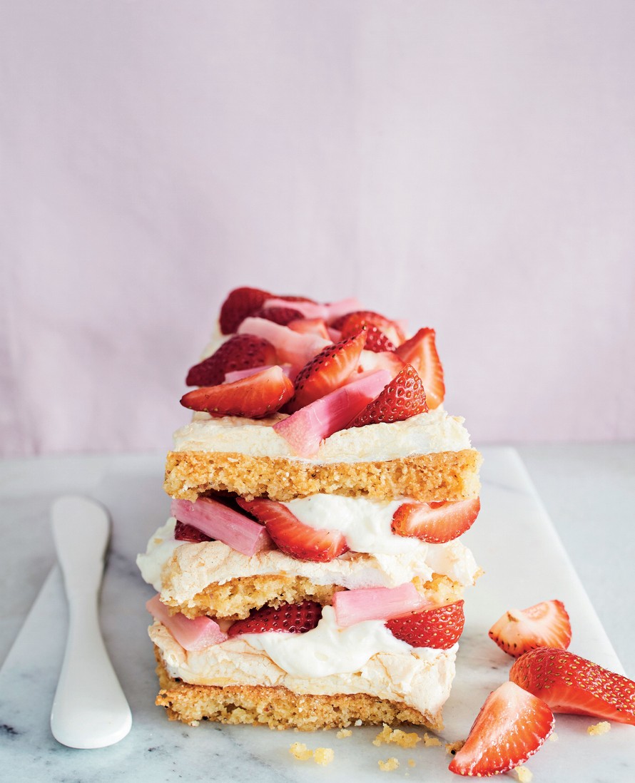 - Täytä kakku juuri ennen tarjoilua. Leikkaa jäähtynyt kakkupohja kolmeen osaan. Levitä kermavaahtoa ja päälle mansikoita ja raparpereja. Nosta toinen levy päälle ja jatka täyttämistä. Koristele pinta mansikoilla ja raparpereilla.