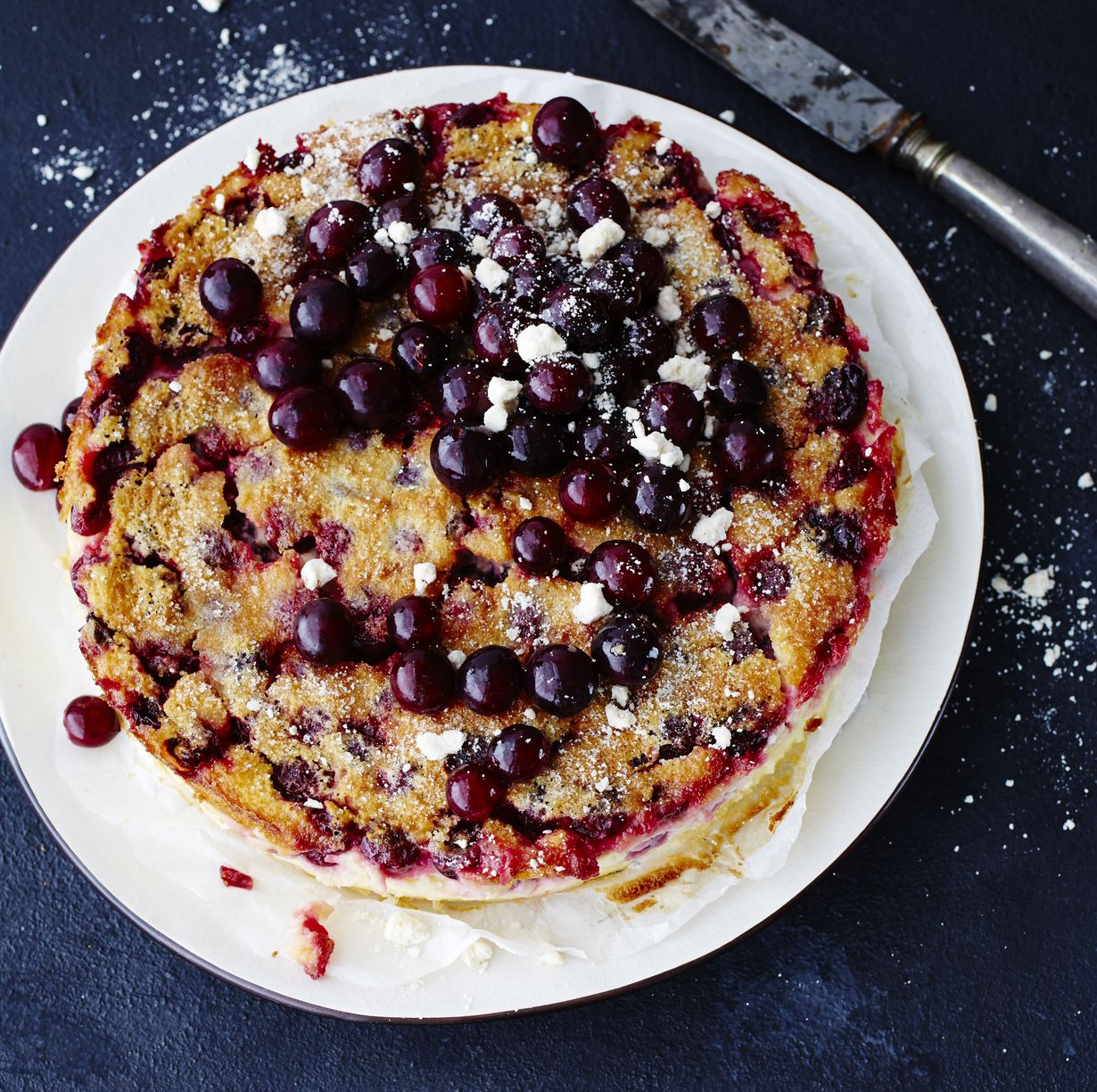 - Ota kourallinen karviaisia erilleen koristelua odottamaan. Laita loput karviaiset vuokaan. Kaada taikina päälle. Kypsennä uunissa 30 minuuttia. Ripottele ruokosokeria pannarin pinnalle ja kypsennä vielä noin 20–30 minuuttia, kunnes pannari on keskeltäkin kiinteä.