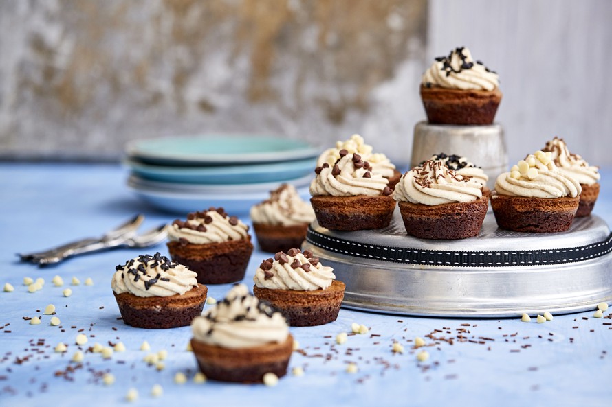 Kuumenna uuni 180 asteeseen. Sulata tumma suklaa ja 50 g voita mikrossa omassa kulhossaan ja valkoinen suklaa ja 50 g voita omassa kulhossaan. Vatkaa kanamunat ja sokerit tehosekoittimella vain sen verran, että sekoittuvat. Älä vaahdota! Mittaa jauhot muna-sokeriseokseen ja vatkaa nopeasti tasaiseksi. Kaada puolet taikinasta toiseen kulhoon ja lisää siihen tumma suklaa kauhalla ripeästi sekoittaen. Kaada valkoinen suklaa toiseen taikinan puoliskoon ja sekoita tasaiseksi. Nosta tummaa taikinaa jokaiseen vuokaan reilu ruokalusikallinen ja valkoista taikinaa saman verran päälle. Nosta uuniin 25 -30 minuutiksi. Anna brownieiden jäähtyä kokonaan ennen kuorruttamista. Säilytä browniet jääkaapissa tai huoneenlämmössä tuorekelmulla peitettynä. Pursota jääkaapissa jähmettynyt kuorrute brownieiden päälle hieman ennen tarjoilua.