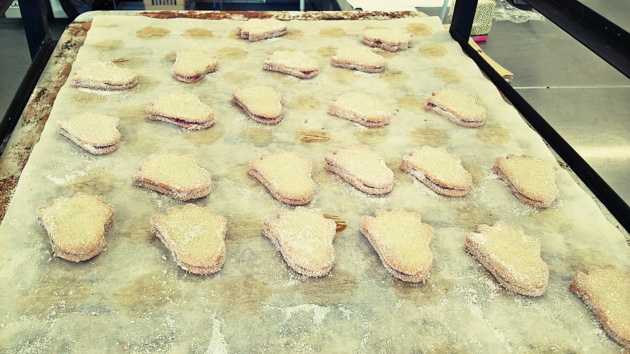 Levitä tai pursota pikkuleipien päälle marmeladia ja paina toinen pikkuleipä kanneksi.