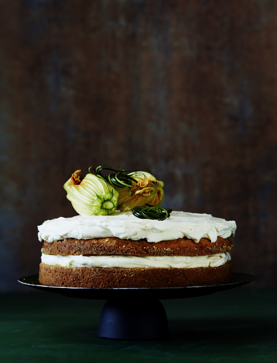 Kesäkurpitsaraaste toimii kakkupohjan mehevöittäjänä. Makua kakku saa pistaaseista, sitruunasta ja valkosuklaasta.