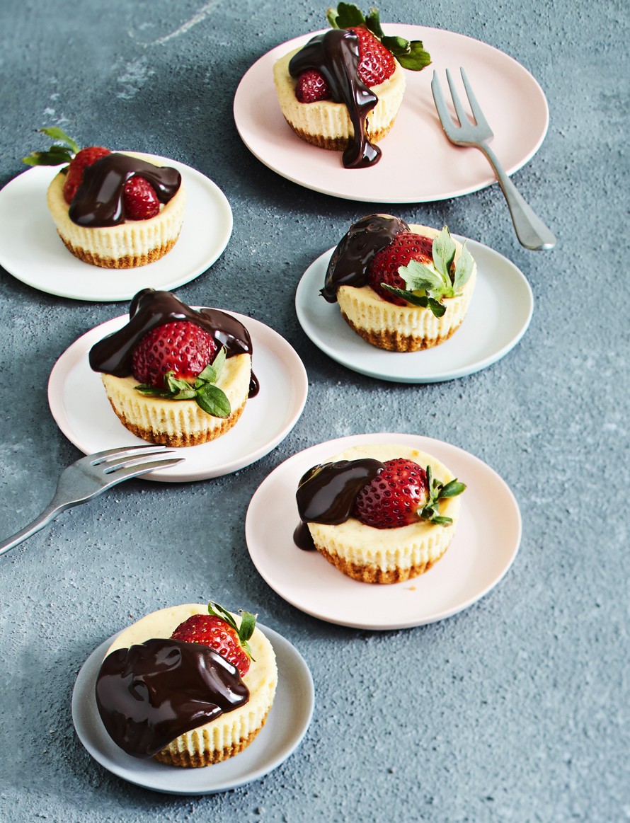- Lusikoi suklaakuorrutusta mansikoiden ja juustokakkujen päälle niin, että sitävaluu myös reunoille.