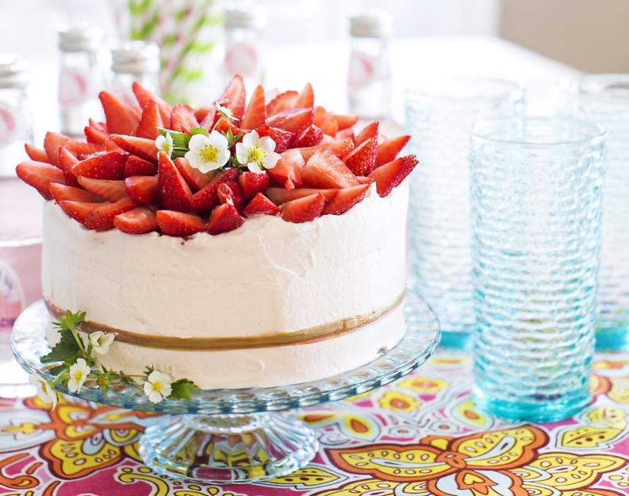 Kesän suloisin kakku kätkee sisäänsä suklaa- ja raparperi-mansikkamoussea.