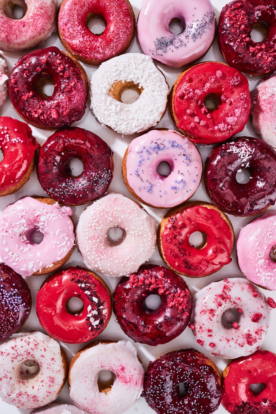 Rinkula on pop! Näitä donitseja ei tarvise uppopaistaa, vaan ne syntyvät kätevästi uunissa. Maku on silti aivan yhtä herkullinen. Kauniit kuorrutteet valmistetaan marjoista ja muista luonnonaineksista.
