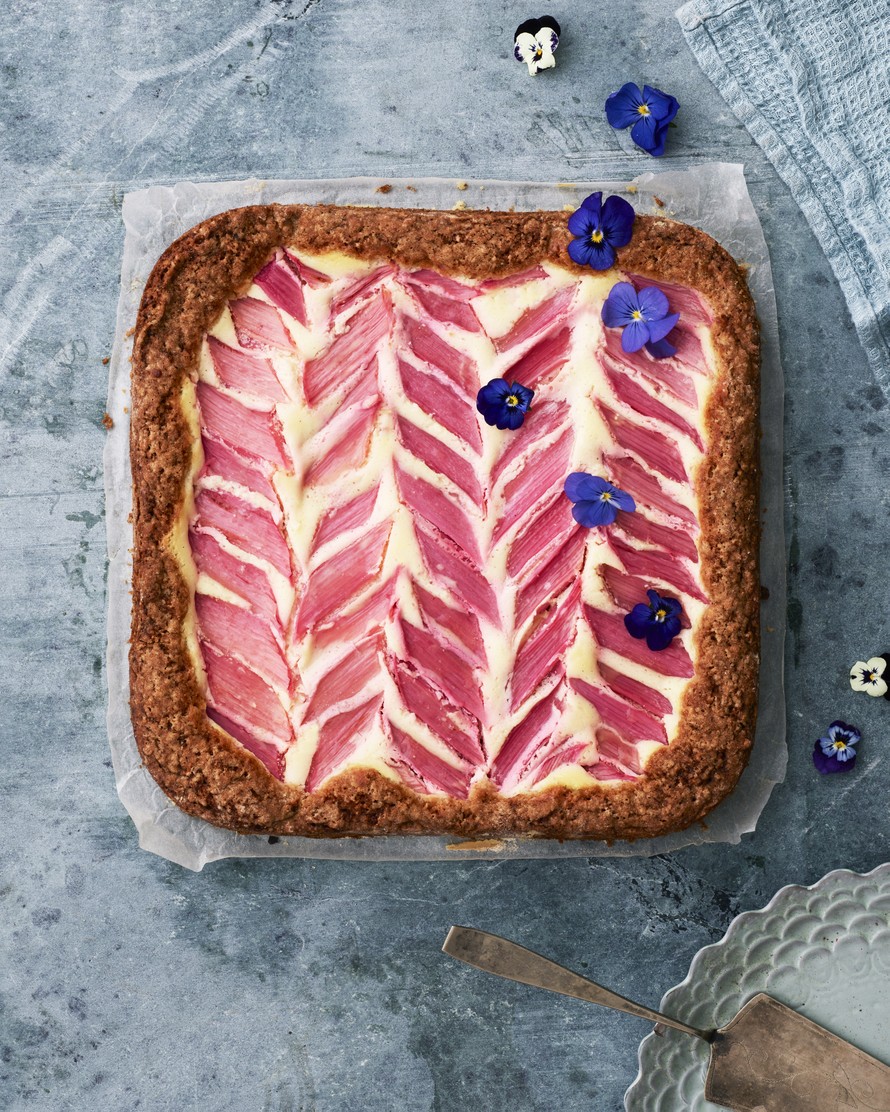 - Leikkaa raparperin varret viistosti 4 cm:n paloiksi ja lado palat riveihin piirakan päälle. Kypsennä uunissa 30 minuuttia.