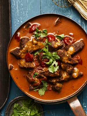 7. Ota liha mausteliemestä, valuta hetki ja viipaloi tarjolle. Tarjoa lisäksi paksoita, soija-seesamikastiketta ja kookosriisiä. Koristele halutessasi viipaloidulla chilillä.