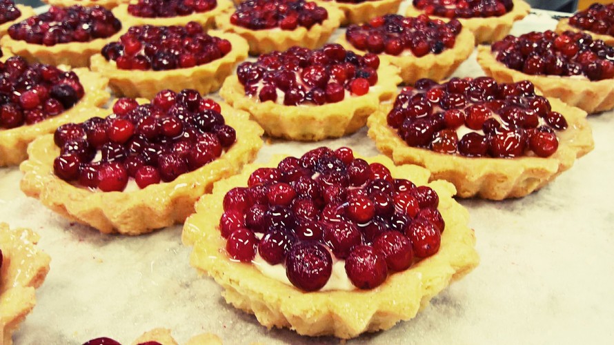 Sekoita jauhot ja sokeri. Nypi huoneenlämpöinen voi jauho-sokeriseokseen ja lisää vesi. Kauli taikina ohueksi ja ota pyöreällä muotilla tai lasilla (halk. 7cm) kiekkoja. Painele taikina pieniin vuokiin. Pistele taikinaan haarukalla reikiä pohjalle ja reunoille.