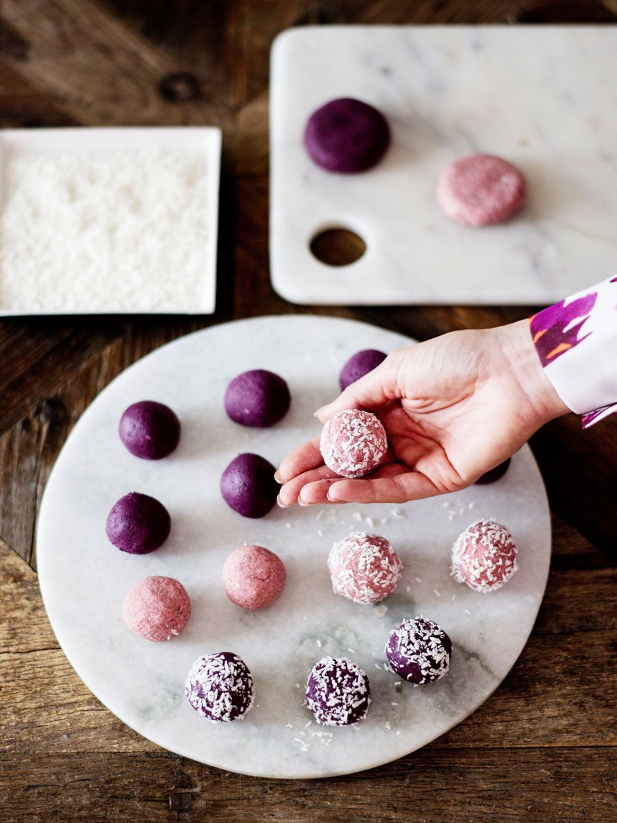 Raakapallot tehdään kaurasta, mansikoista ja kookoshiutaleista. Kaunis lila väri tulee punajuuresta.