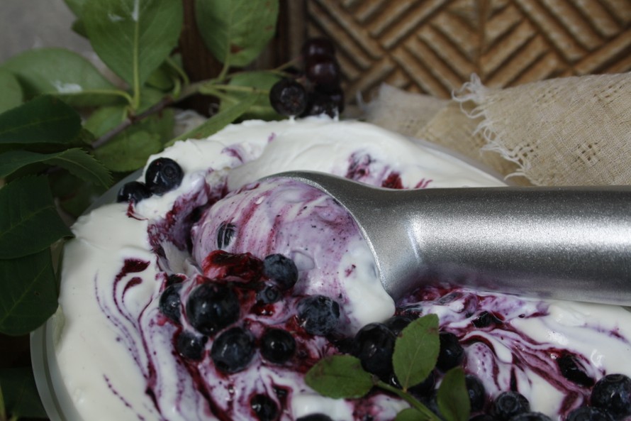 Kaada jäätelömassa laakeaan, pakastuksen kestävään astiaan (tilavuus noin 2 litraa). Nostele pinnalle mustikkasosetta, vetele veitsellä muutaman kerran jäätelöä edestakaisin niin että mustikkasose jää kauniiksi raidoiksi. Ripottele pinnalle mustikat. Peitä jäätelö astia, pakasta vähintään 4 tuntia.