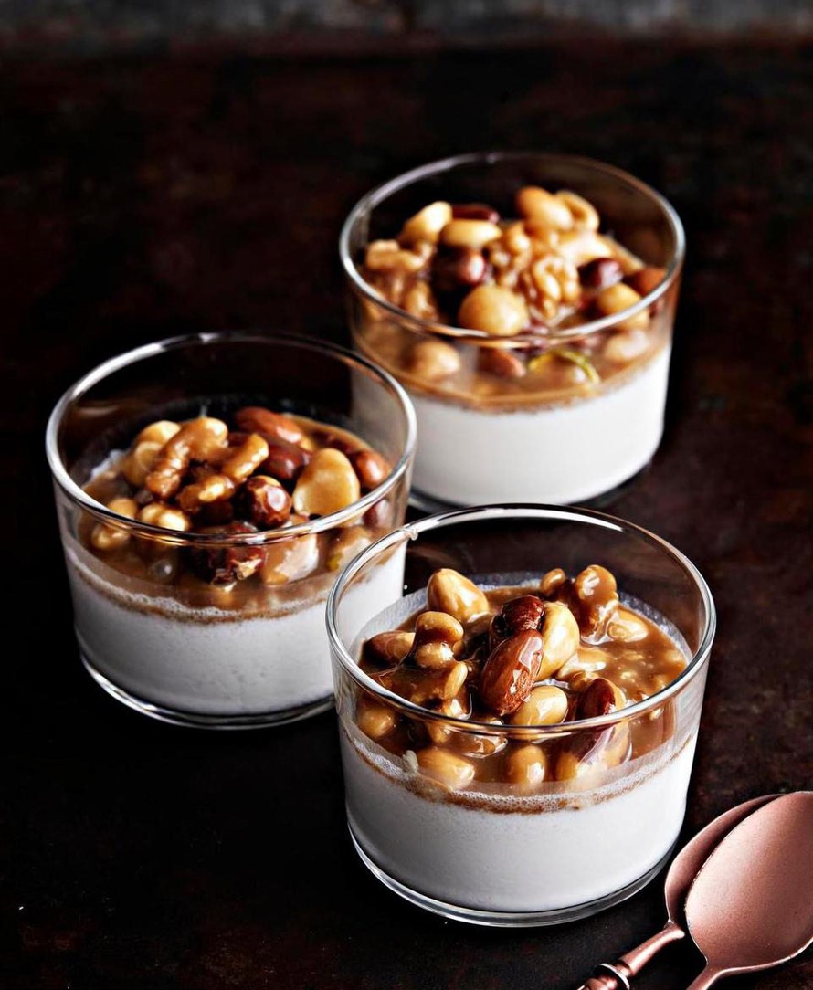 Tee sillä aikaa kinuski. Mittaa kaikki ainekset kattilaan ja keitä noin 10 minuuttia. Kaada kulhoon ja anna jäähtyä ja kiinteytyä loppuun huoneenlämmössä tai nopeuta jäähtymistä jääkaapissa. Kääntele pähkinät kinuskiin ja nosta hyytyneiden pannacottien päälle.