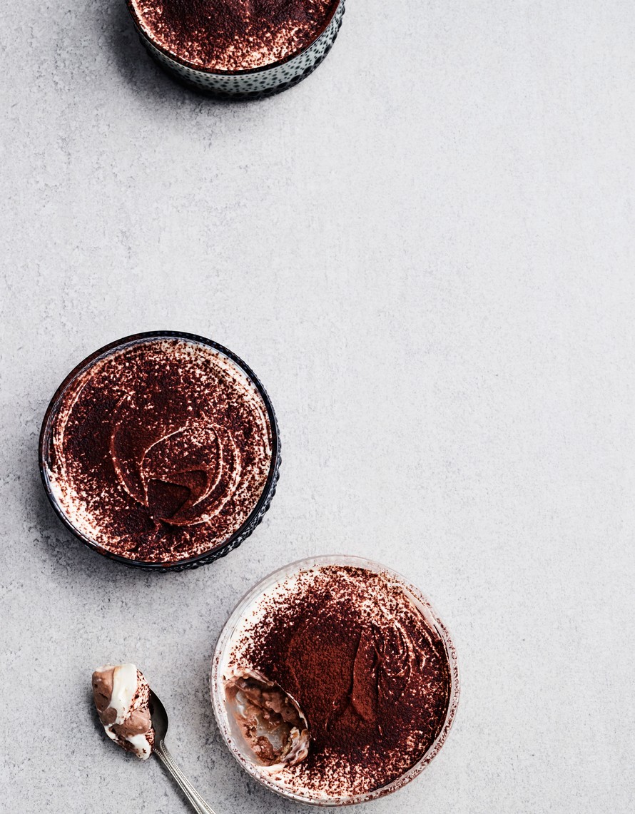 - Lusikoi suklaavaahto, suolakaramelli ja viimeiseksi mascarponevaahto kostutettujen keksien päälle. Siivilöi kaakaojauhe pinnalle.