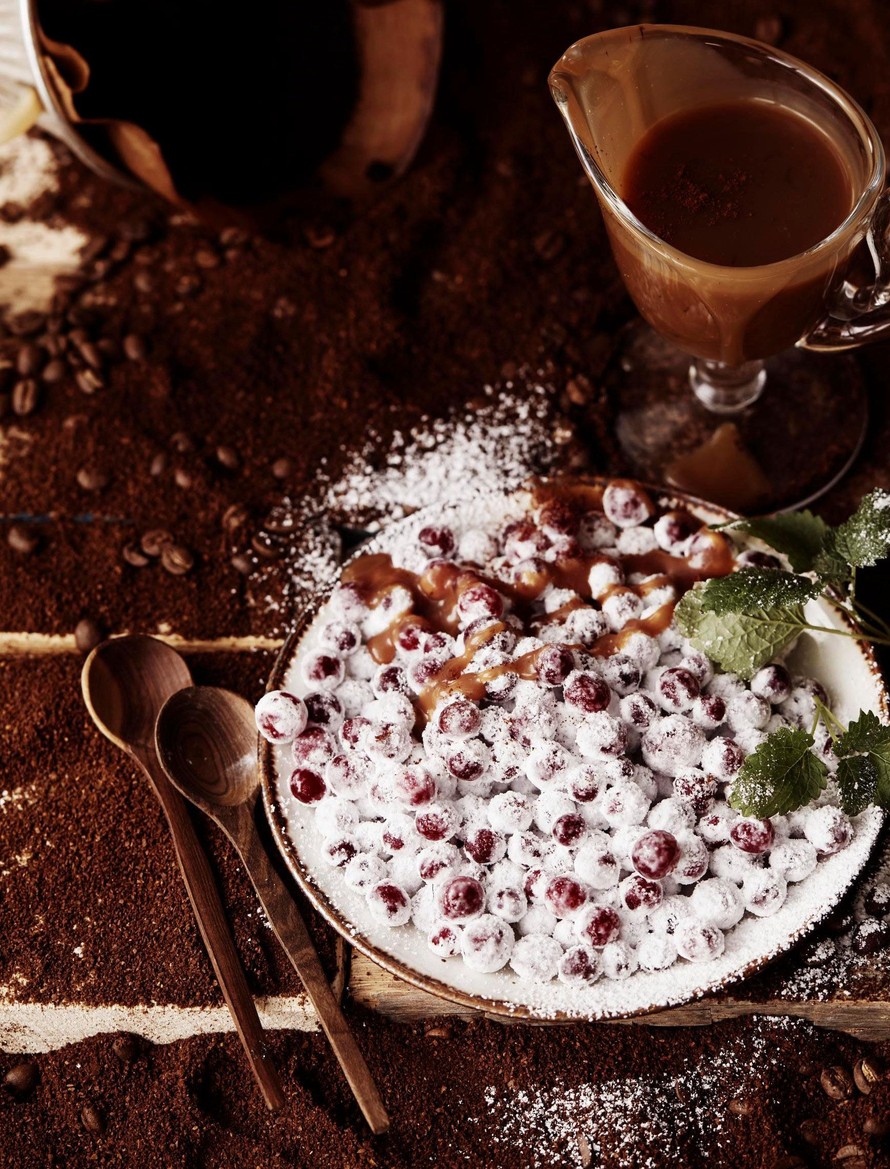 Kohmeiset, lumiset sokerikarpalot nautitaan kahvilta maistuvan lämpimän kinuskin kanssa.