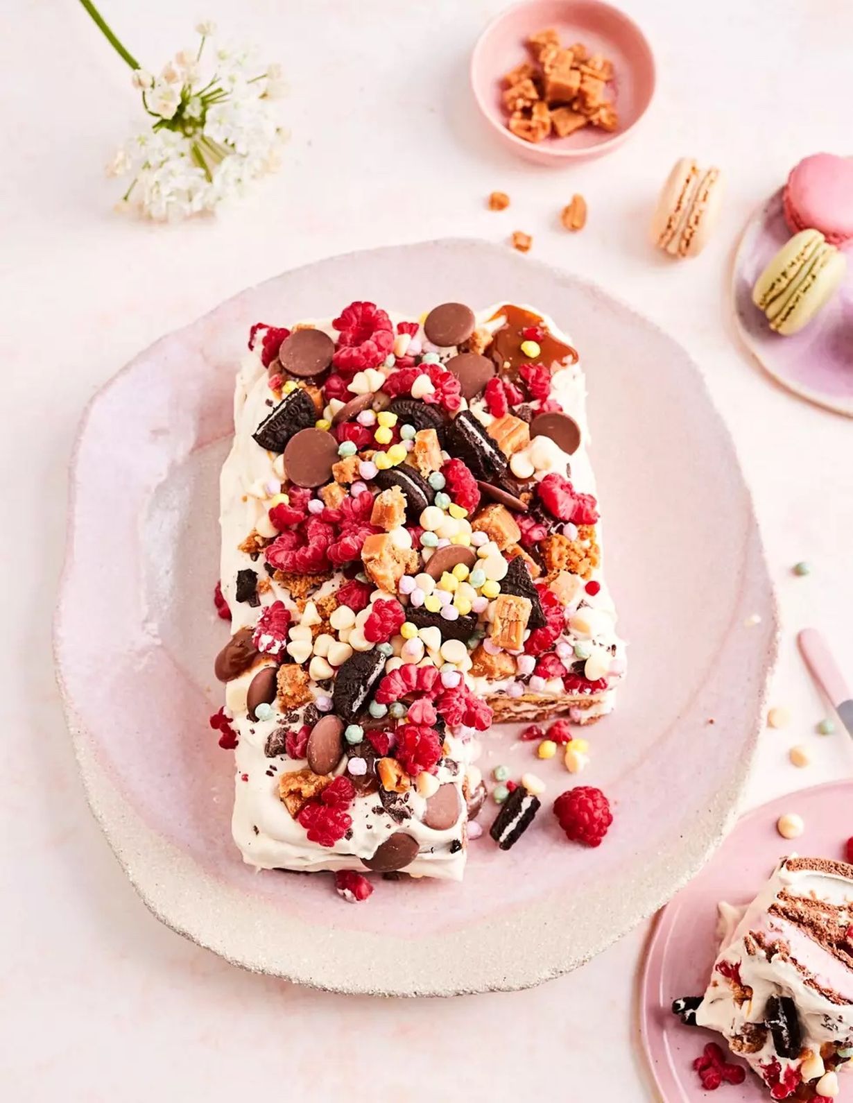 - Koristele kakku valuttamalla päälle karamellilevitettä. Viimeistele vadelmilla, kekseillä ja muilla haluamisilla makupaloilla.