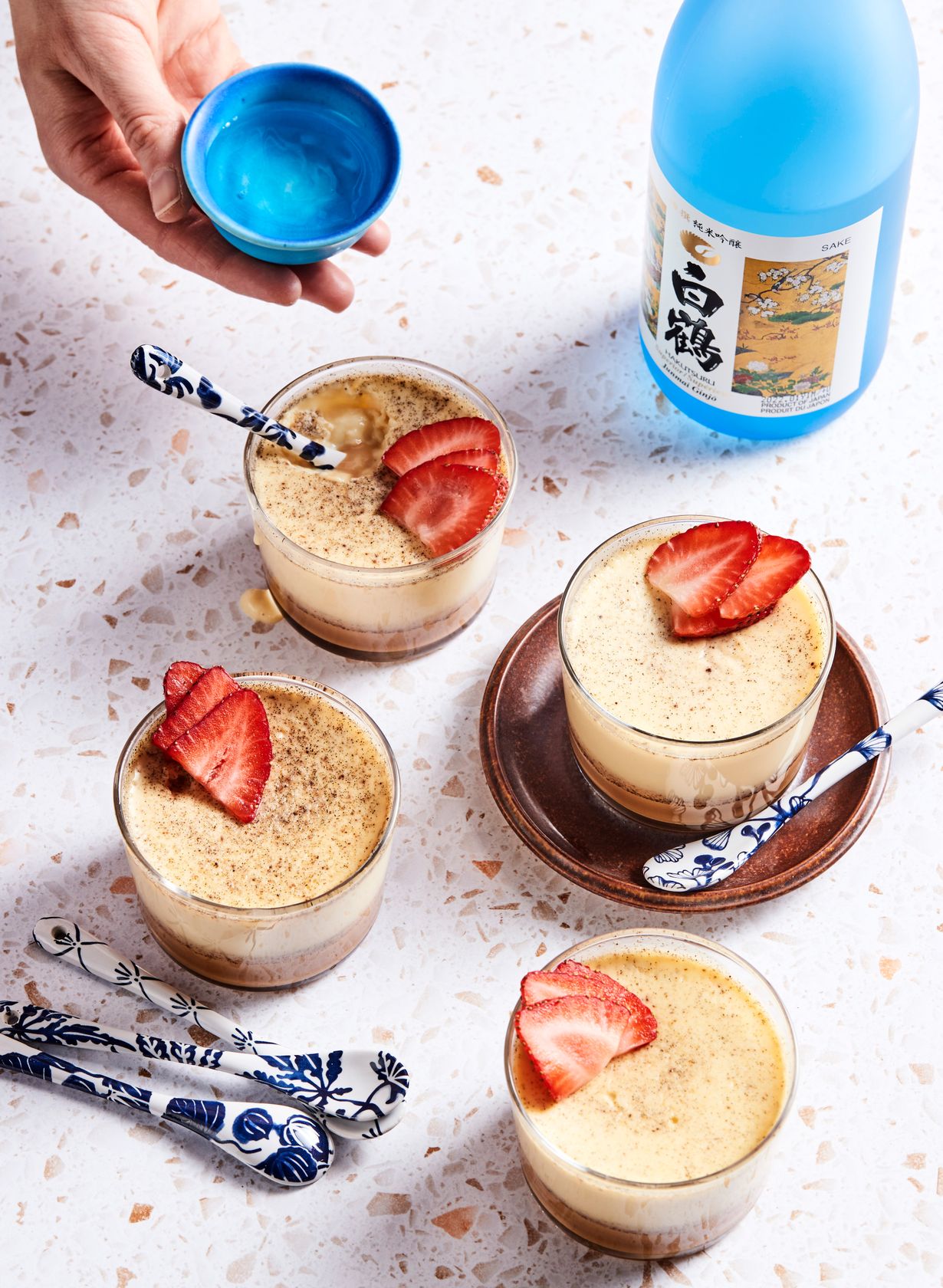 Peitä kulhot foliolla ja laita jääkaappiin. Vanukkaat saavat tekeytyä vielä yön yli. Koristele viipaloiduilla mansikoilla.