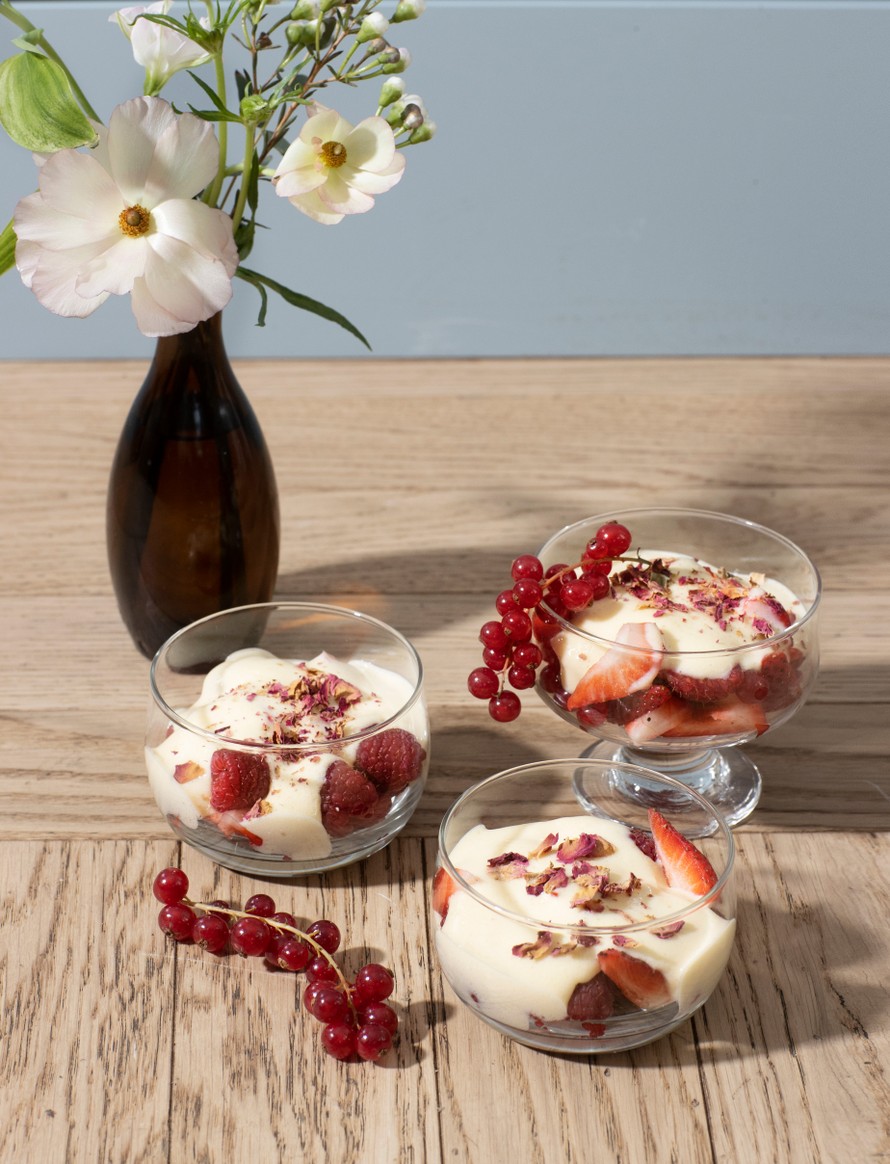 Pilko isot mansikat muutamaan osaan. Jaa marjat annoskulhoihin ja kaada päälle zabaglione-kastiketta. Koristele jälkiruoat tuoreilla tai kuivatuilla syötävillä kukilla. Tarjoa heti.