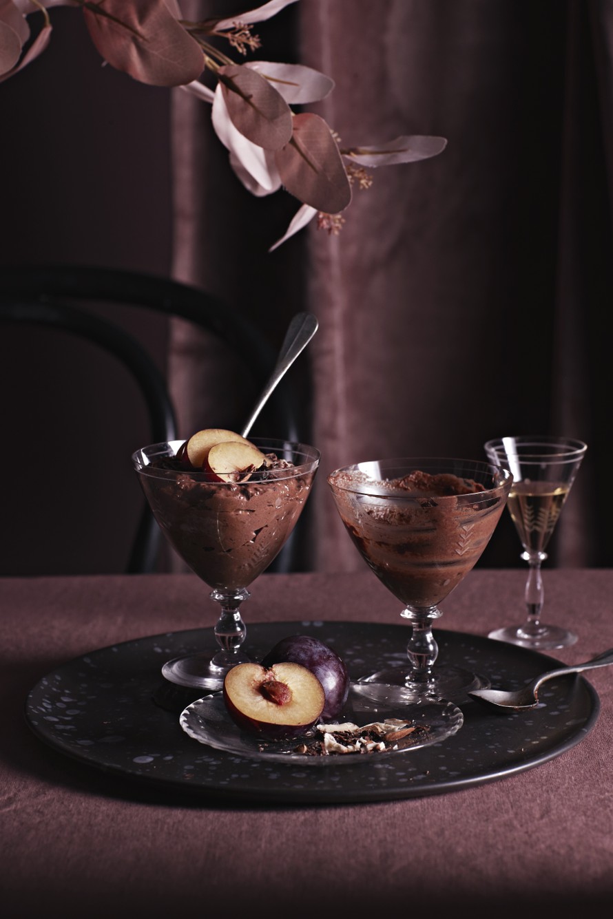 Joulun tyylikkäin jälkiruoka on konjakkiluumuilla aateloitu suklaamousse. Voit valmistaa mousset annosmaljoihin viilentymään hyvissä ajoin ennen tarjoilua.