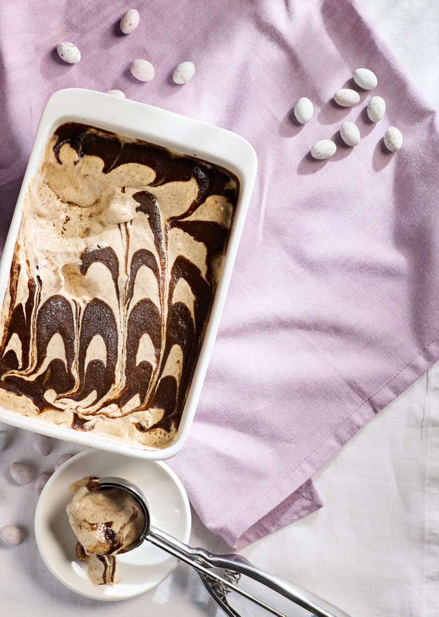 Mämmi ja appelsiinimarmeladi liukuvat sulavasti yhteen jätskiannoksessa. Herkku on näppärä tehdä valmiiksi pakastimeen odottamaan.