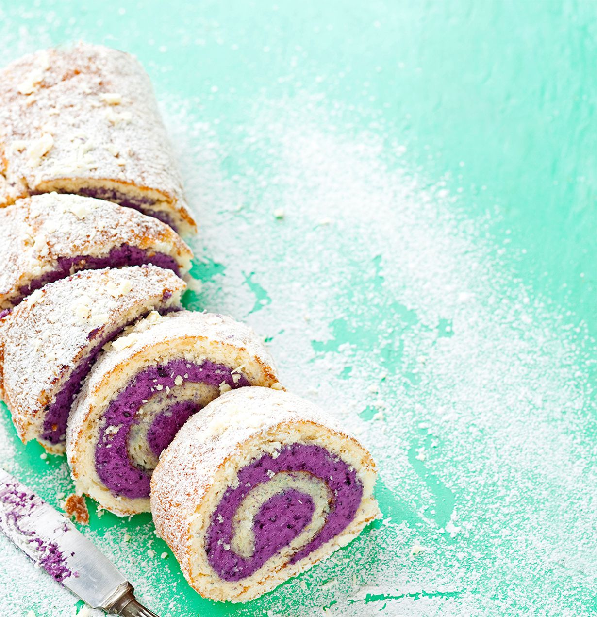 4. Levitä päälle mustikkamoussea, kun torttupohja on jäähtynyt huoneenlämpöiseksi. Jätä pari senttiä reunoilta täytteestä vapaaksi. Kääräise pitkältä sivulta alkaen rullaksi. Kääräise torttu vielä leivinpaperin sisään ja anna tekeytyä noin tunnin ennen tarjoilua.