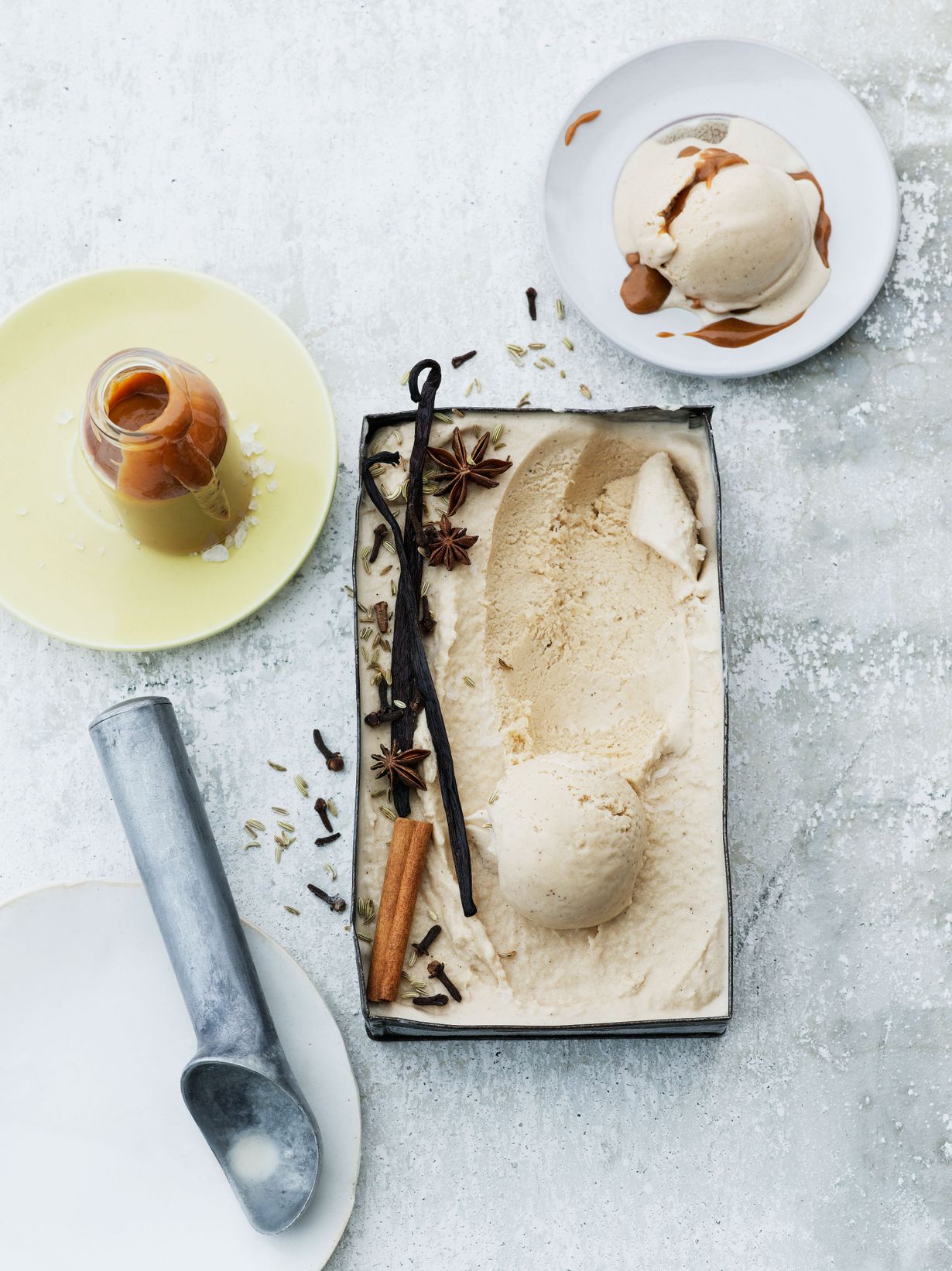 - Siivilöi mausteiden palat ja vaniljatanko jäätelömassasta ja kaada massa hitaasti pyörivään jäätelö-koneeseen. Pakasta, kunnes jäätelö on koneen ohjeen mukaisesti valmista.