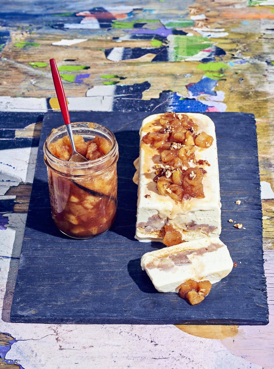 Tämän herkullisen kakun tekeminen kannattaa aloittaa jo tarjoilua edeltävänä päivänä, sillä hillo on valmistettava ensin. Voit toki oikaista ja käyttää jäätelökakkuun kaupan omenahilloa.