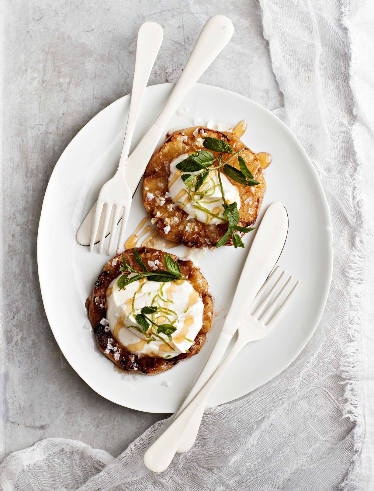 Nosta paistetut ananakset annoslautasille ja laita päälle vuohenjuustomoussea. Koristele hunajalla, limetinkuoriraasteella ja mintulla. Tarjoa heti.