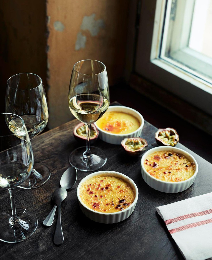 Viinisuositus: Mitä makeampi jälkiruoka, sitä makeampi saa viinikin olla. Klassinen ranskalainen sauternes, kuten Château d’Arche 2015, 20,23 e (0,375 l), on ylellinen jälkiruokaviini. Maussa on trooppisten hedelmien vivahteita. Viinin hunajaisuus yhdistyy upeasti brûléen kermaisuuteen. Alkoholiton ja myös kepeämpi juomavaihtoehto on intialainen musta assam-tee, kuten Clipper RK Assam Bio. Mukavan tumma ja jopa hieman maltainen tee sopii hienosti kermaisen, makean jälkiruoan seuraan.