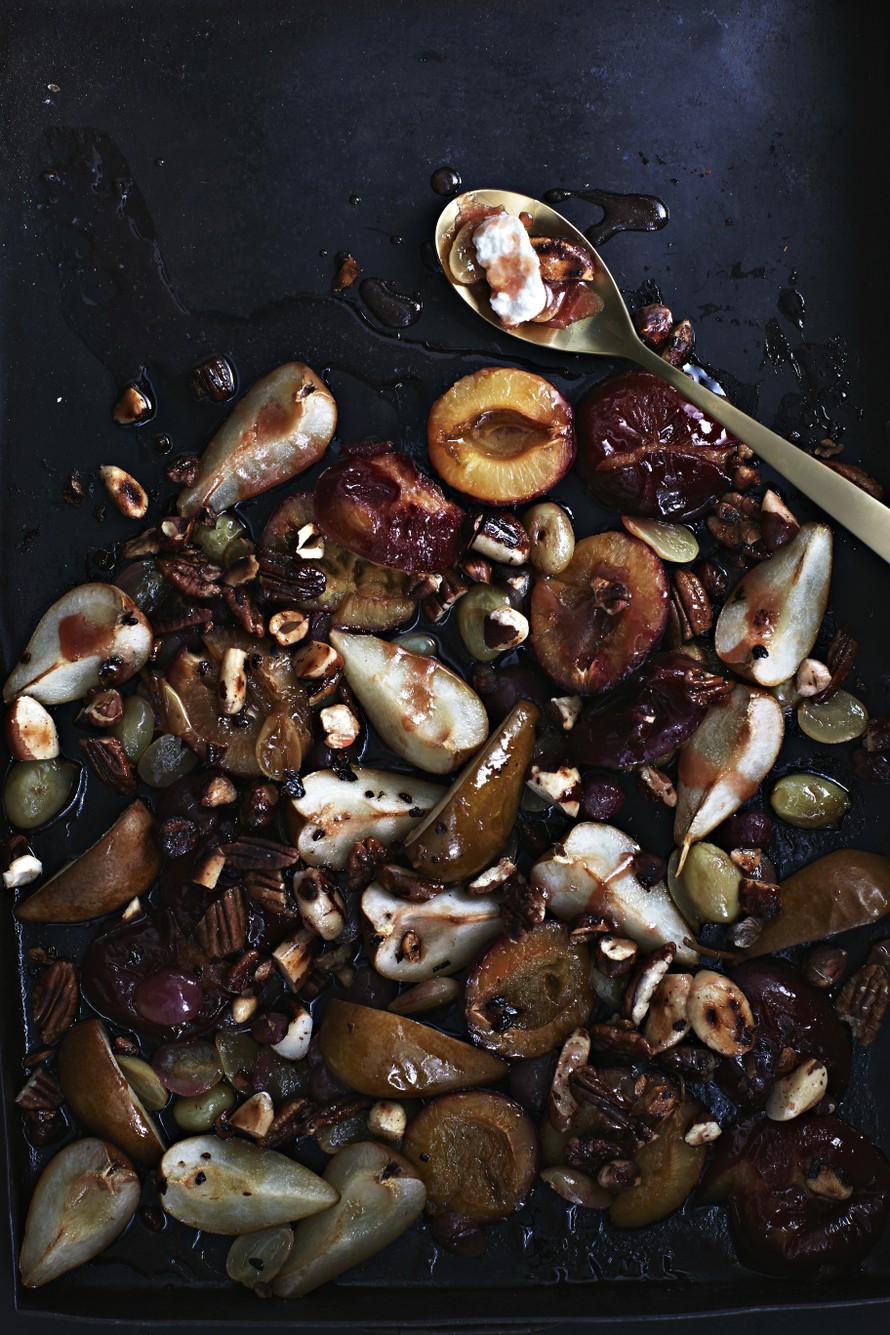 - Laita uuni kuumenemaan 200 asteeseen. Halkaise luumut ja poista kivet. Lohko päärynät neljään osaan ja poista siemenkodat. Puolita rypäleet. Levitä hedelmät leivinpaperille uunipellille. Sulata voi ja valuta se hedelmille. Ripottele sokeri päälle.