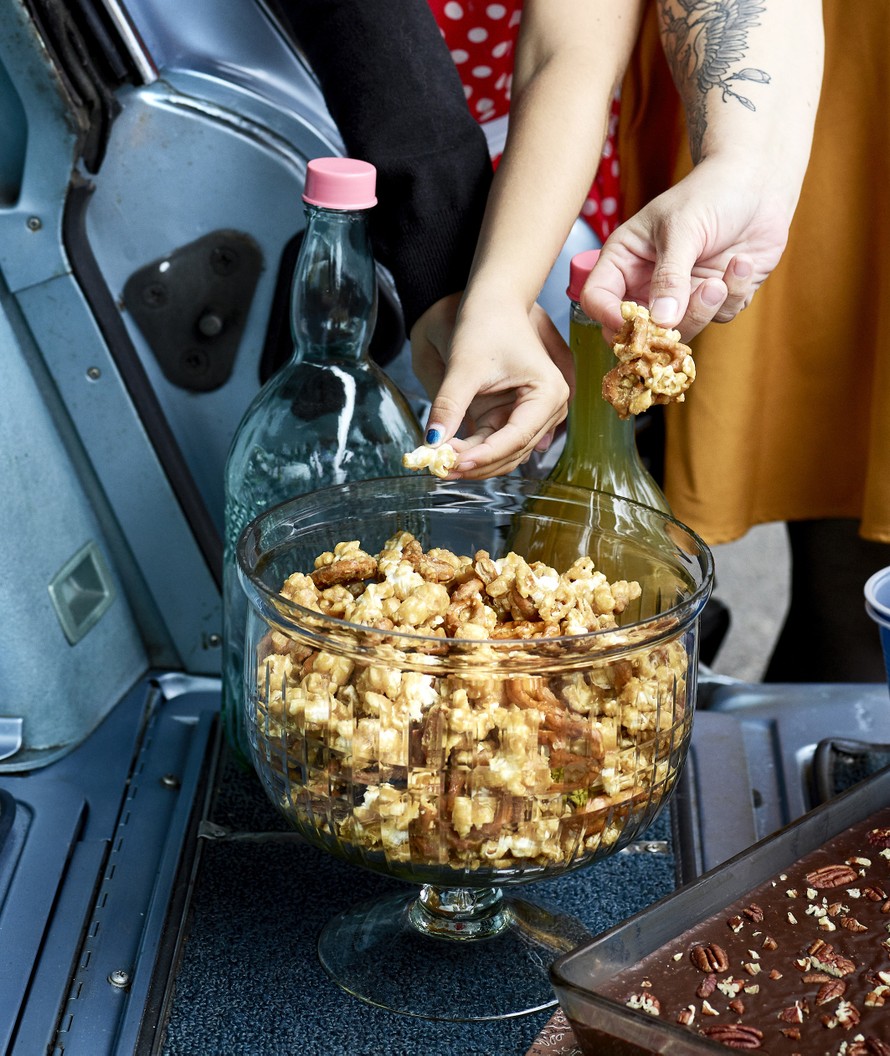 Pretzelit, popparit ja tahmainen karamellikastike tiivistyvät namuksi, joka ei jätä makeanhimoisia rauhaan ennen kuin kulho on tyhjä.