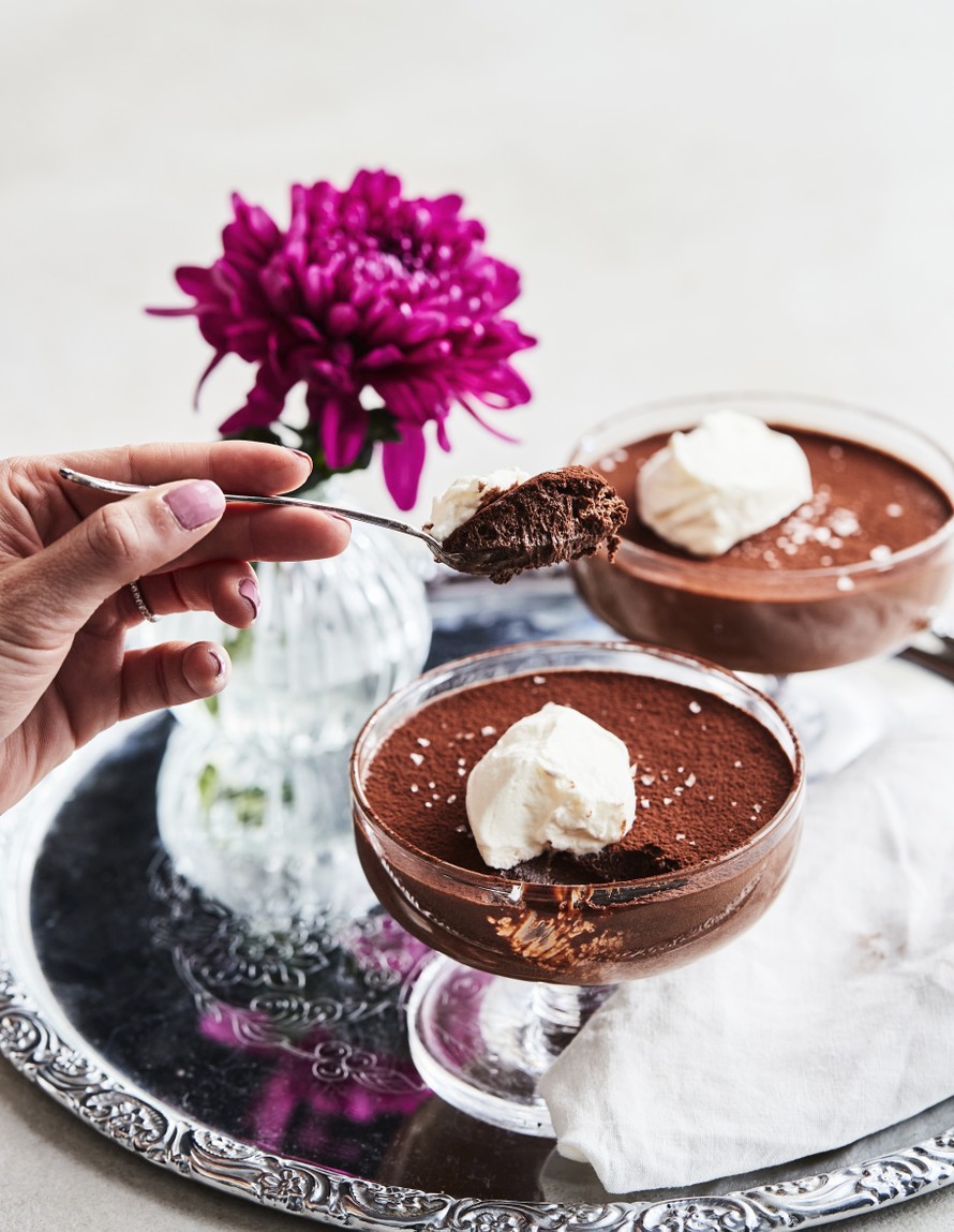 - Nosta annokset kylmästä juuri ennen tarjoilua. Sirottele pinnalle tummaa kaakaojauhetta ja pieni ripaus merisuolahiutaleita ja nosta päälle lusikallinen löysäksi vatkattua kermavaahtoa.