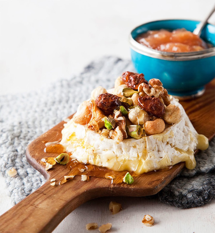 Laita brie-juuston päälle pähkinöitä, hunajamanteleita, kaiken kruunuksi hunajaa.