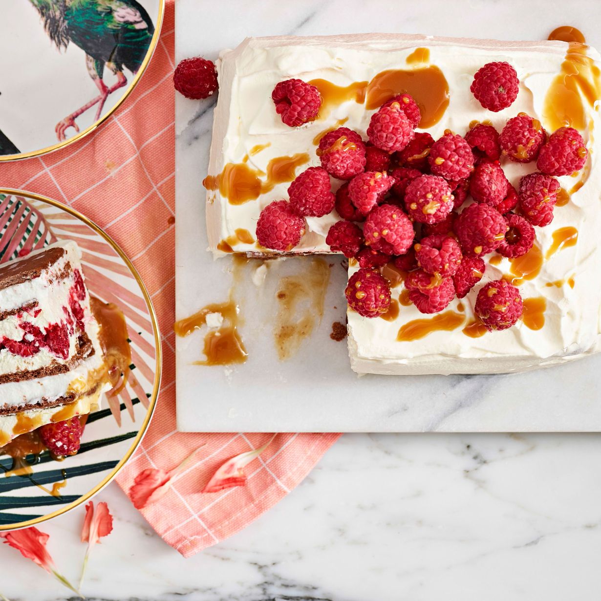 Supernopea jäätelökakku ladotaan puffeteista, täytetään kermavaahto-jugurttitäytteellä ja raikastetaan kerroksella vadelmia.
