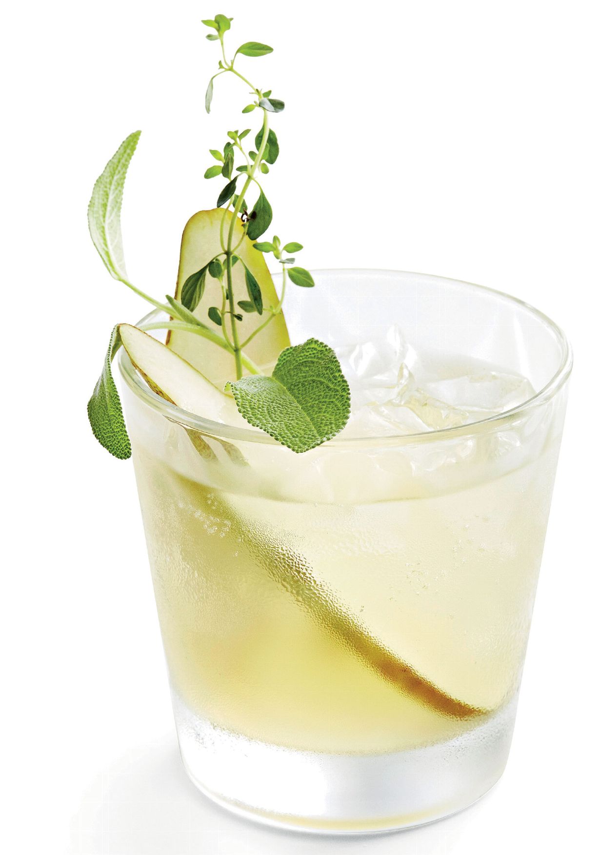 - Mittaa likööri, päärynäkuutiot, yrtit ja jäämurska ravistimeen. Ravista ja kaada siivilän läpi lasiin.