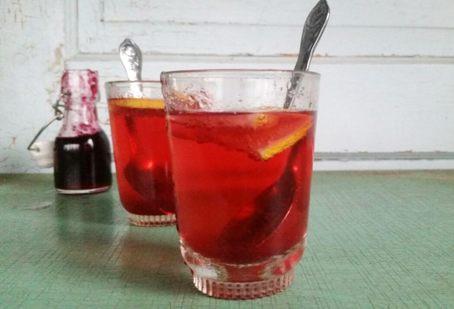 Laita lasin pohjalle lusikallinen karpalosiirappia. (Katso karpalosiirapin ohje täältä!)