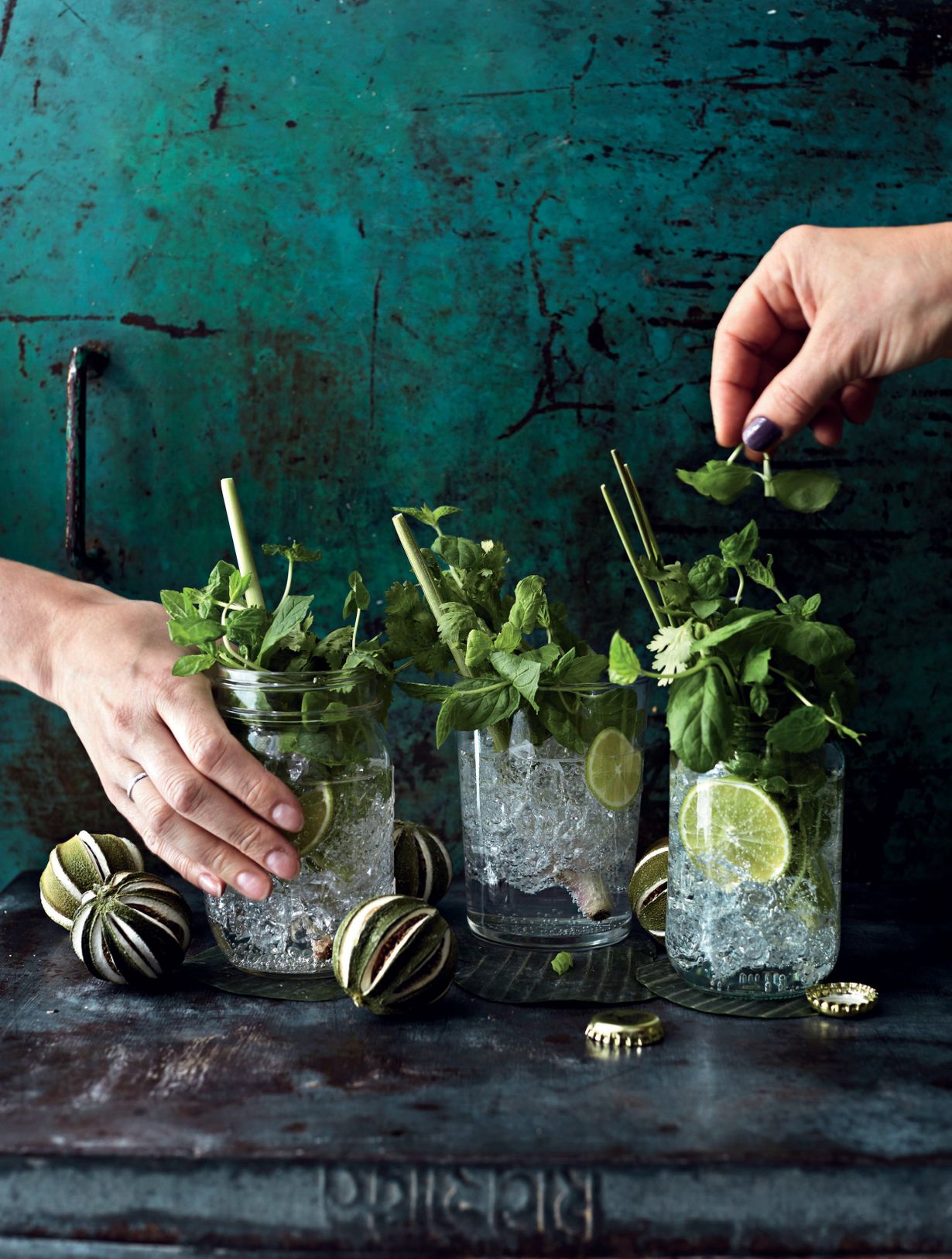 - Leikkaa limetti viipaleiksi ja irrota mintunlehdet. Lisää limetit ja yrtit laseihin.