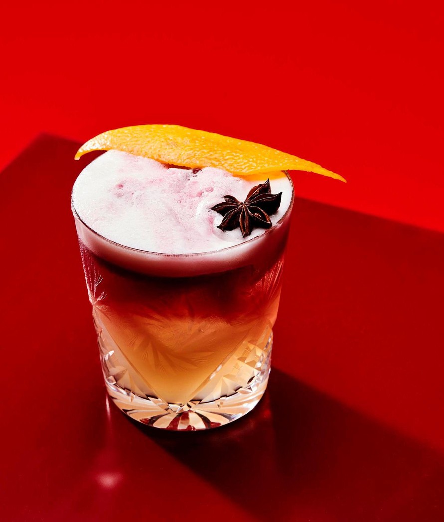 Tummaa, mausteista rommia ja tuhtia punaviiniä sisältävä mausteinen sour toivottaa rentouttavaa joulua.