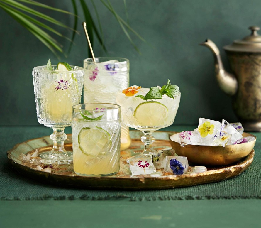 Jäitä, sitruunan tai limetin viipaleita, minttua (ja syötäviä kukkia)