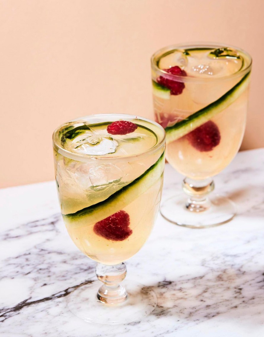 Laatikkoviinin pohjista ja kivennäisvedestä syntyy sitruunan, kurkun ja vadelman avustuksella loppukesän raikkain vähäalkoholinen cocktail.